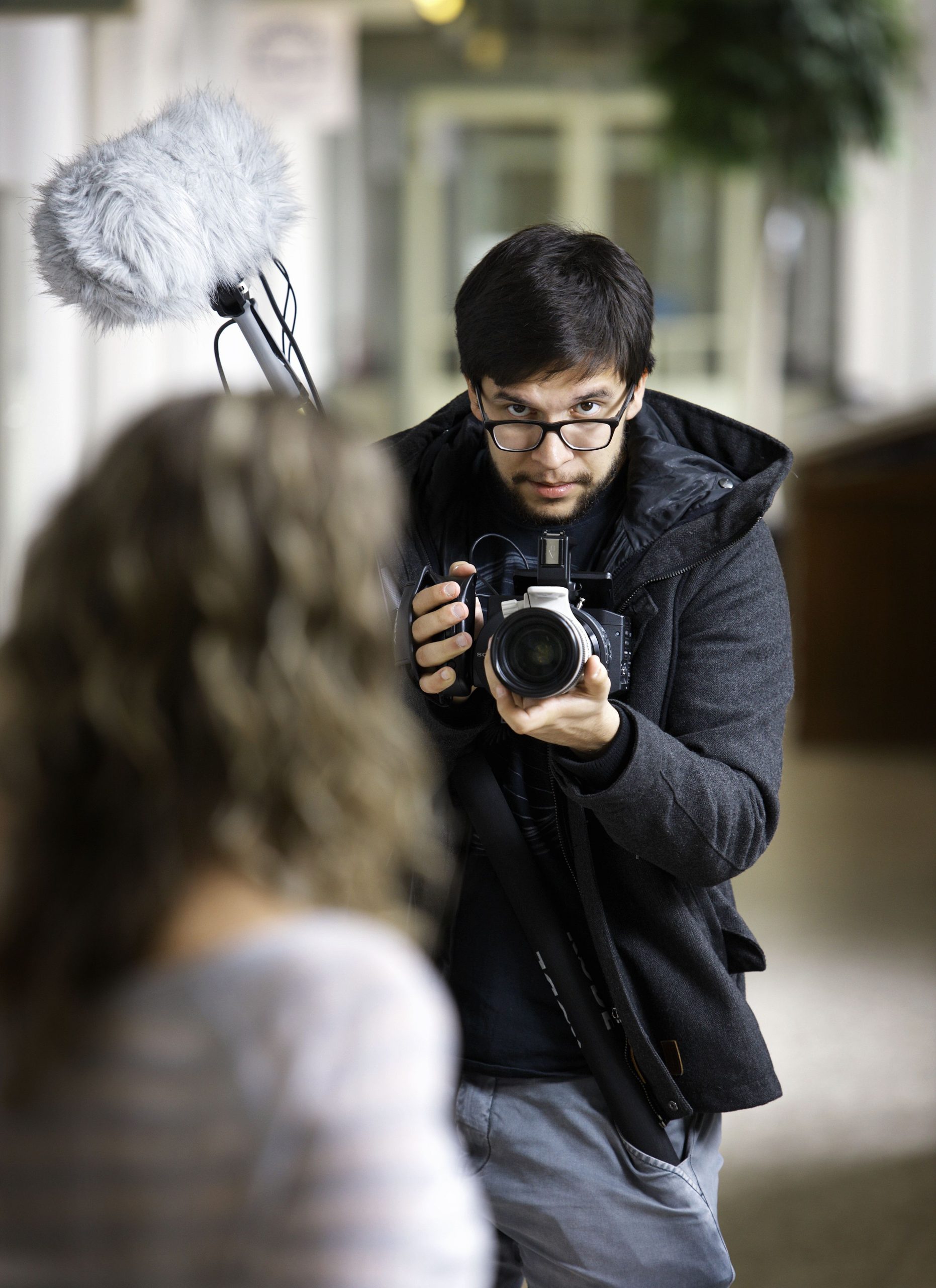 One day while cycling through campus, Hussain saw some people using professional film equipment so he stopped to talk to them. He expressed his interest and, to his surprise, they offered him a job. Now working for Kinetic Vision while he