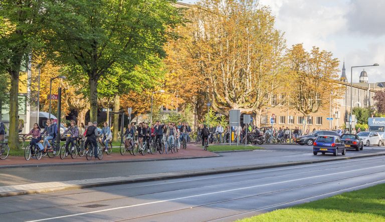 Het kruispunt Jaffalaan-Mekelweg. De TU heeft jaren geleden alweer verkeersregelaars aangesteld zodat de fietsersstroom af en toe onderbroken kan worden voor kruisende auto's. (Foto: Thomas Zwart)