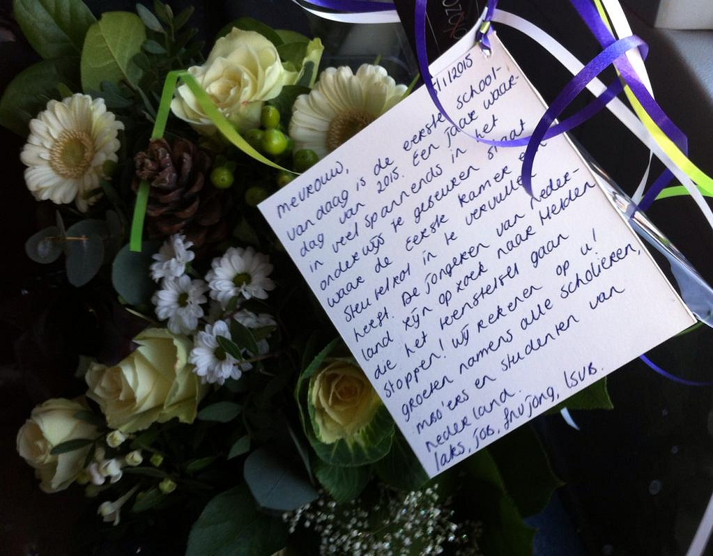 Acht senatoren krijgen een bos bloemen van scholieren, studenten en mbo’ers. Op het kaartje staat: “De jongeren van Nederland zijn op zoek naar helden die het leenstelsel gaan stoppen! Wij rekenen op u!”