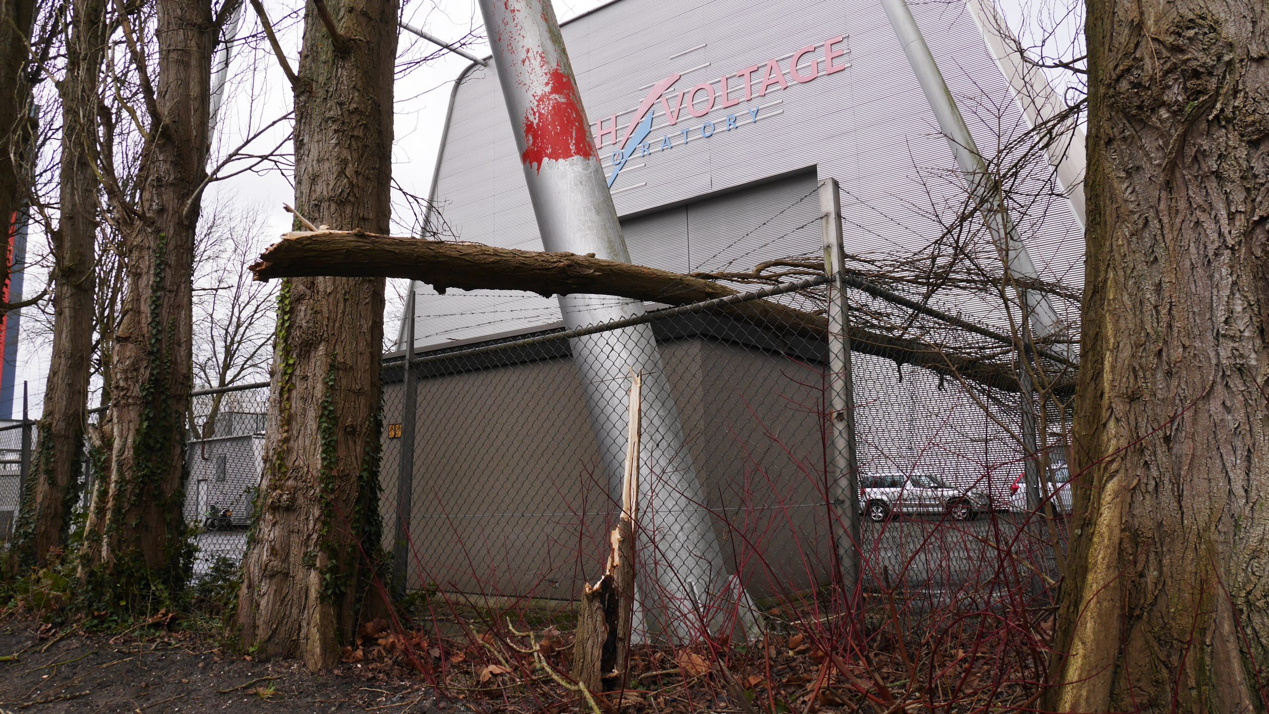 Verderop, op het dak van laboratorium Stevin-3 van de faculteit Civiele Techniek en Geowetenschappen is één van de zonnepanelen door de storm losgekomen van zijn bevestiging. Uit voorzorg zijn tot nader orde de wegen parallel aan Stevin-3 afgesloten. Het betreft de Pieter Callandweg en de Van der Burghweg. Bezoekers moeten om het pand heenlopen.