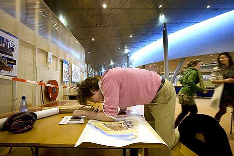 Bezoekers wanen zich in elke projectruimte in een ander continent. Dat komt door grote afbeeldingen aan de wand, aparte kleuren, eigen banken en lampen. Zo krijgt de ‘projectruimte Afrika’ een lamp van zonnebrillen. Studenten en medewerkers zeggen straks wellicht: Ik zie je in Afrika’. Achter de projectruimtes, rechts in de centrale hal, komen langwerpige ‘treinbanken’ met hoge rug, poefjes en tafels. Waarschijnlijk waar nu de garderobe is, komt een koffiecorner. De tijdschriften verschuiven meer naar rechts om plaats te maken voor lange tafels met computers. Bezoekers kunnen zich daar inloggen met hun net-id.