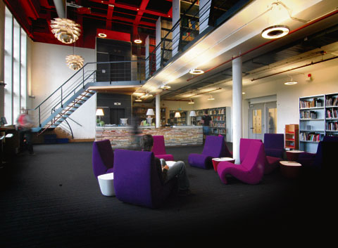 Op de eerste verdieping boven de centrale hal bevindt zich de geredde bibliotheek. Boeken uit de ramsj vormen een creatieve balie. De bouwstenen voor het toekomstige icoon Bouwkunde bestaan vooralsnog uit ideeën.