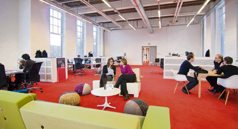 Het hoofdgebouw heeft minder vloeroppervlak, maar met twee grote serres heeft Bouwkunde nu ruim 37 duizend vierkante meter tot haar beschikking. De bijna duizend medewerkers moeten het voortaan doen met 470 bureaus: flexwerken dus. Wel zijn er 350 extra werkplekken in de vorm van loungehoeken en overlegzitjes.