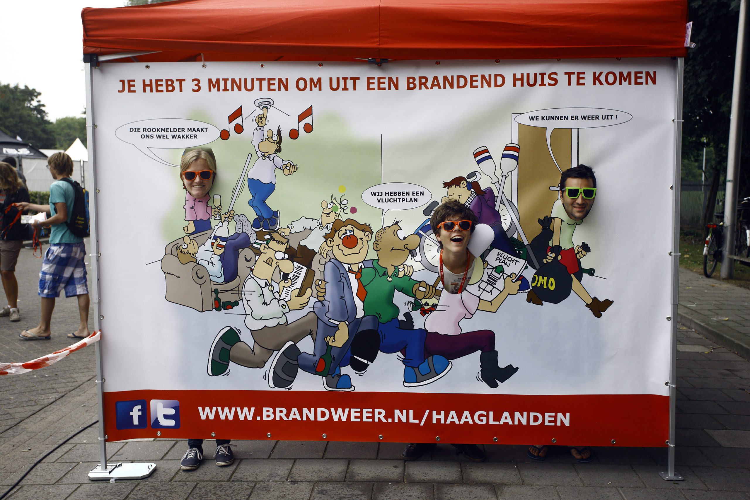 Hoe brandveilig is jouw studentenhuis? Aankomende studenten hebben waarschijnlijk andere dingen aan hun hoofd,toch kreeg brandweer Haaglanden ze tijdens de Owee zo ver ze met hun eigen mobieltje te fotograferen achter dit spandoek, in de hoop dat die foto’s op social media belanden.