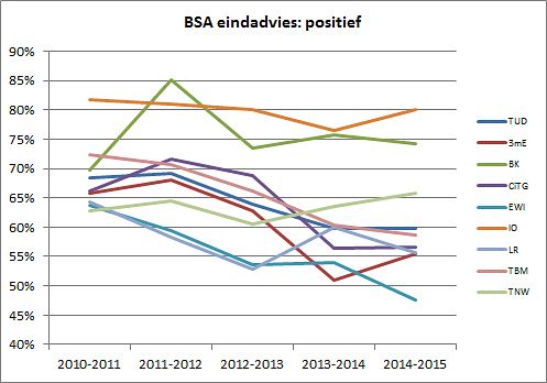 Het aantal positieve adviezen vertoont sinds de invoering van het bsa over het geheel genomen een licht dalende lijn. In studiejaar 2010-2011 ging het om 68 procent en in 2011-2012 om 69 procent. In 2012-2013 ging de bsa-norm omhoog van 30 studiepunten naar 45 studiepunten. Het bsa daalde naar 64 procent en zakte in 2013-2014 verder naar zestig procent. Afgelopen jaar was het dus ook zestig procent.