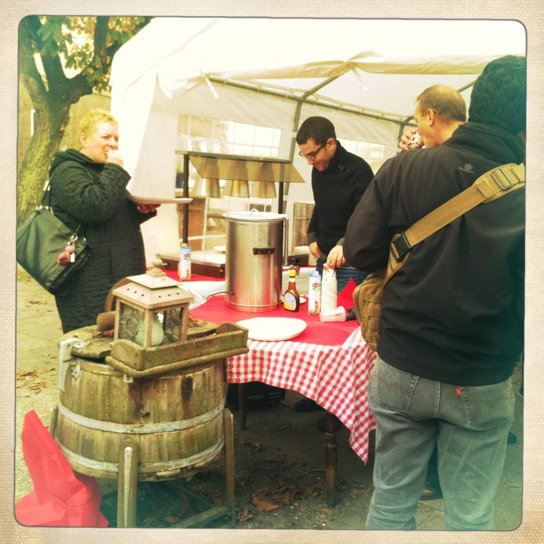 del, bij pannenkoeken en bolletjes kaas. Koffie uit tanks, een partytent voor het
