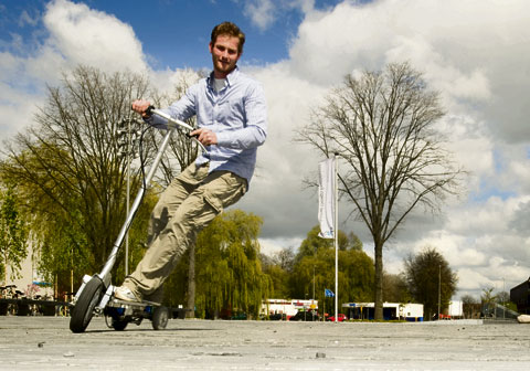 De grijns wijkt geen moment van zijn gezicht als Arnold Dijkstra, afstudeerder bij Industrieel Ontwerpen, zijn elektrostep ‘Wheelie’ demonstreert. Het elektrisch aangedreven stepje haalt dertig kilometer per uur, zodat je als bestuurder met gemak tussen de fietsers door slalomt. De techniek van de besturing is geïnspireerd op het snowboard, waar je al carvend door de bocht snijdt. Op het stepje doe je dat, net als op het board, door met je gewicht over te hellen. Dat geeft een ongelofelijke wendbaarheid: tijdens de demonstratie draait Dijkstra gemakkelijk een 360-graden rondje op de nieuwe brug tussen IO en de Mekelweg. Daarna geeft hij weer ‘gas’ met de handel op het stuur, en het voorwiel giert alweer over het wegdek. Door een toevallige keuze heeft de Wheelie een ongekend koppel meegekregen. Rijden op de Wheelie is fun. Dat straalt er van af.