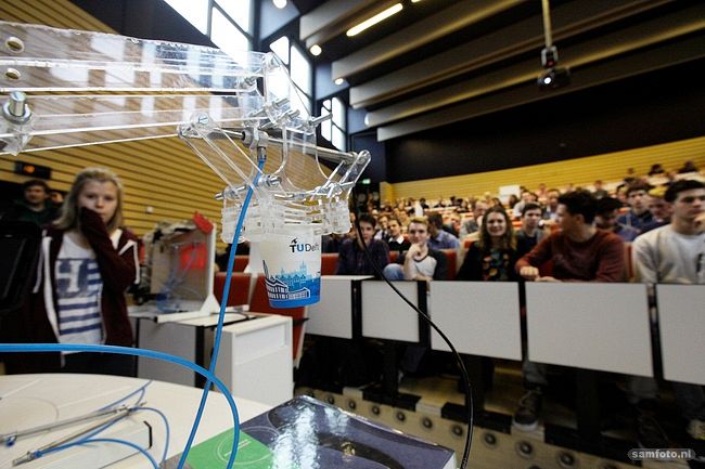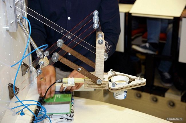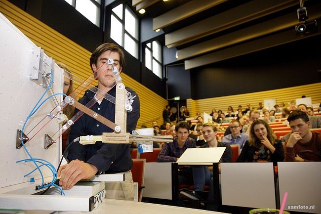 Docent dr.ir. Gerwin Smit zag zich dit jaar geconfronteerd met 670 eerstejaars werktuigbouwkundestudenten. Samen met hoofddocent dr.ir. Gabrielle Tuijthof en dr.ir. Regine Vroom (allen bij 3mE) gaf Smit dit jaar het vak technische systemen aan de hand van een bijzondere ontwerpopdracht. De studenten moesten een mechanische grijper ontwerpen en maken die een koffiebeker van maximaal vijfhonderd gram kan beetpakken en 25 centimeter kan optillen. De inhoud kan brons, water of pasta zijn, maar moet wel in de beker blijven.