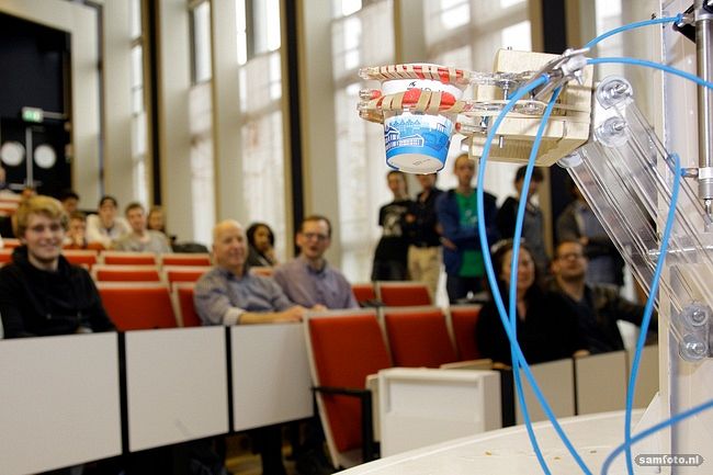 Met de laser-gesneden kunststof grijper is de Helios (groep 09) een esthetische verschijning. Dat de grijper niet laag genoeg kwam, losten de studenten op met Calculus. Het dikke boek bracht het bekertje binnen bereik. Door heel behoedzaam de ventielen te bedienen wisten de studenten de meeste inhoud binnen te houden. Alleen tuimelde er wel een beker water om. Over het wiskundeboek inderdaad. Score: 0 punten.