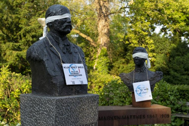 Extinction Rebellion Delft climate activists have again blindfolded statues in their city on Sunday 11 June to draw attention to the climate crisis. Among the eight statues were Willem de Zwijger at Prinsenhof and the busts of J.C. van Marken & Agneta van Marken in Agnetapark. They were given protest signs around their necks with texts like ‘don’t look away’, ‘be fair’ and ‘this is a climate emergency’.