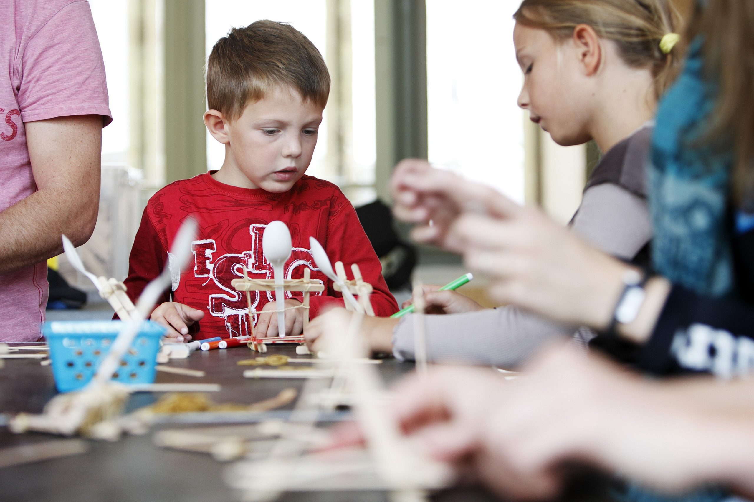 Zo ook bij het Science Centre, waar kinderen vanwege het Weekend van de Wetenschap een lepelblijde – een variant op de katapult – konden bouwen.