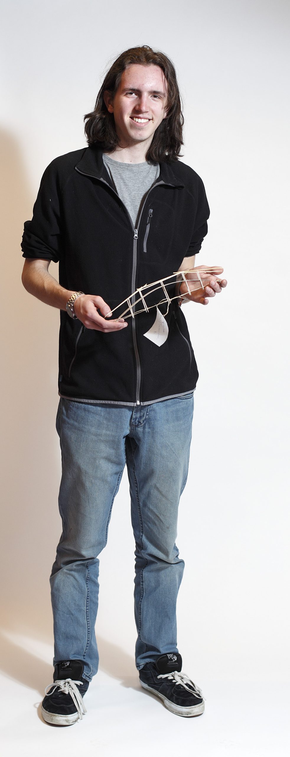Een meisje gebruikt liever ijzerdraad, maar weet niet hoe ze dat zonder schaar moet doorknippen. Van der Zaag doet het voor: flink aan het draad draaien. Ze kijkt met de moed der wanhoop. Een andere kandidate loopt met haar enorme vel karton Van der Zaag bijna omver. “Past je brug in het model?”, vraagt hij aan Wassenaar. Ja. “Mag ik het even zien?” Nee. “Het moet nog even drogen.”