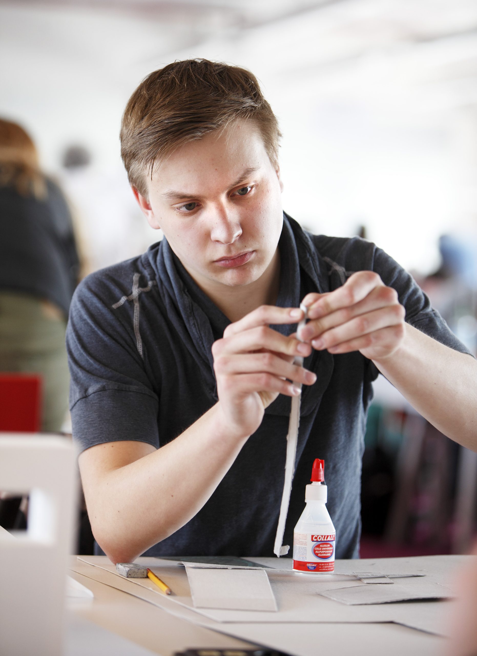 De toets voor de decentrale selectie bij Bouwkunde is begonnen. Van de 150 scholieren die een test op de website hebben doorstaan, zijn er 144 komen opdagen. Drie opgaven – ontwerpen, construeren en sturen – testen hun vermogen om bouwkundige vraagstukken op te lossen. De studenten die als eerste zullen construeren, vinden op tafel een moedermaquette bestaande uit twee gebouwen. Daarnaast liggen potjes lijm, pennen, potloden, gummetjes, schildertape, touw, tandenstokers, satéprikkers, paperclips, punaises, elastiekjes, mesjes, linialen, ijzerdraad en grote vellen karton.