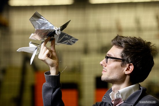 Stel je eens voor dat je ’s nachts de vliegtuighal van de faculteit Luchtvaart & Ruimtevaarttechniek (L&R) binnensluipt. Met snode plannetjes om je nieuwe verovering de F16 te showen. Equivalent aan het ‘Wil je mijn brommer zien?’ maar dan beter. Terwijl jullie gniffelend achter elkaar aanlopen, klinkt even verderop in de hal een geluid. Als twee Sherlocks gaan jullie op onderzoek uit. Achter een zwartgekleurd net treffen jullie een handvol zespotige beesten op de grond. Ze scharrelen rond, terwijl in de lucht een dozijn reuzelibelles fladdert. Ze lijken goedaardig en als jullie samen door hun ruimte lopen, gaan ze opzij. Verwonderd kijken jullie elkaar aan. Het lijkt wel een dierentuin, maar dan eentje die bestaat uit louter robots.