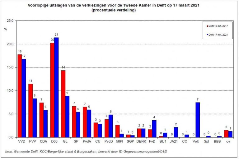 D66 is in Delft de grootste partij bij de Tweede Kamerverkiezingen, net als in 2017. De VVD is de tweede en GroenLinks de derde partij. Dat blijkt uit de voorlopige verkiezingsuitslag die de gemeente op 18 maart heeft gepubliceerd. Waar D66 ditmaal wat is gegroeid, krimpen VVD en GroenLinks. Opvallend is dat nieuwkomer Volt 7 procent van de stemmen heeft gehaald. Daarmee is het in Delft de vijfde partij, vóór CDA, PvdA en PvdD. (SB)
