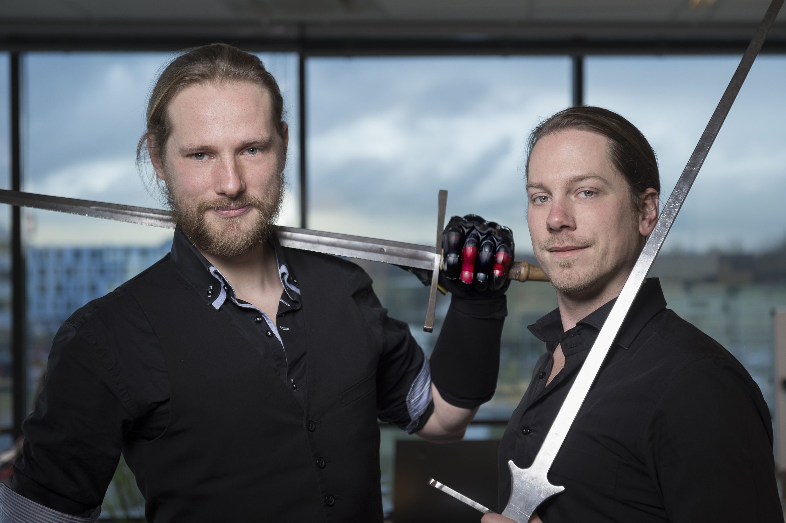 CrossGuard, het bedrijf van industrieel ontwerper en TU-docent Maarten Kamphuis (34) en zijn compagnon Youval Kuipers (33), draait om zwaardvechten. (Foto: Marcel Krijger)