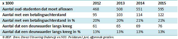 Op 1 juni 2015 waren er 122 duizend oud-studenten met een betalingsachterstand. Dat is dertig procent meer dan in 2012, meldt de NOS. Maar de omroep vergeet dat het aantal aflossers in drie jaar tijd ook met dertig procent is toegenomen. Ook in 2012 was een vijfde van de terugbetalers te laat.