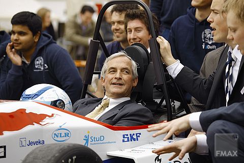 Meer dan vijfhonderd studententeams van over de hele wereld strijden in juli om de titel op het circuit van Silverstone. De Delftse studenten die een jaar aan de racewagen hebben gewerkt, verwachten veel van hun op bio-ethanol rijdende bolide. Ook rector Luyben, hier op de foto in de cockpit, lijkt het wel te zien zitten.