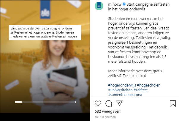 According to the Hoger Onderwijs Persbureau (Higher Education Press Agency), the enthusiasm among students to get tested has been small so far. And they don’t always know that they have to order the tests themselves online. The government wants to change that. Minister van Engelshoven therefore calls on students to make as much use as possible of the free self-tests.
