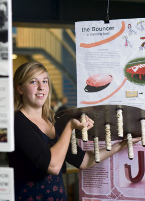 Het is een best zwaar ding, de Bouncer die IO-studente Roos Stone ontwikkelde in opdracht van hockeyfabrikant Dita International. Stalen poten omwikkeld met postbode-elastiekjes en een zware stalen deksel moeten tegenwicht bieden tegen het geweld van gepushte en geslagen hockeyballen.