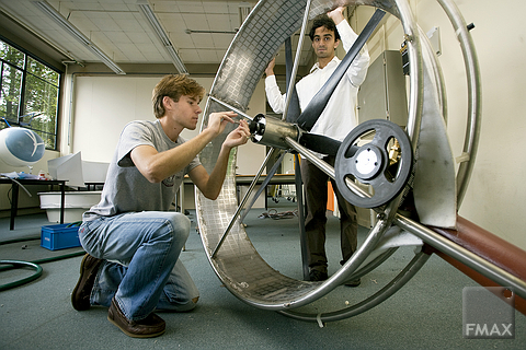 Studenten Berend Jan Kleute (3mE) en Sachim Navalkar (L&R) werken nog aan wat een sproeiende fontein in de vorm van een waterlelie moet worden voor in het Mekelpark. Plaatsing omstreeks november.