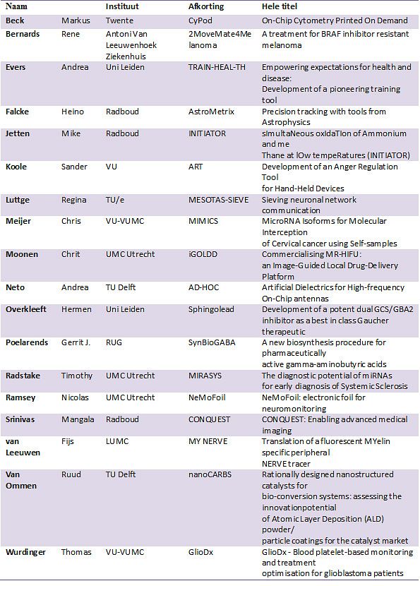 Deze proof of concept-beurzen zijn bestemd voor wetenschappers die hun kennis met eerdere EU-subsidies hebben opgedaan. Met achttien toekenningen scoort Nederland goed. Alleen het Verenigd Koninkrijk (22 beurzen) en Spanje (twintig beurzen) kregen er meer.