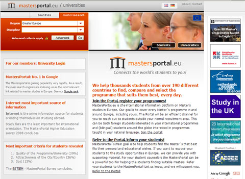 De site mastersportal biedt eenvoudig doorzoekbare informatie over 9400 Europese masteropleidingen in 32 landen. Per opleiding is informatie opgenomen over onderwerpen, inhoud, structuur, collegegeld, vereisten, data en duur. Daarnaast is informatie te vinden over de betreffende universiteit, het stad en het land en immigratieregelingen.