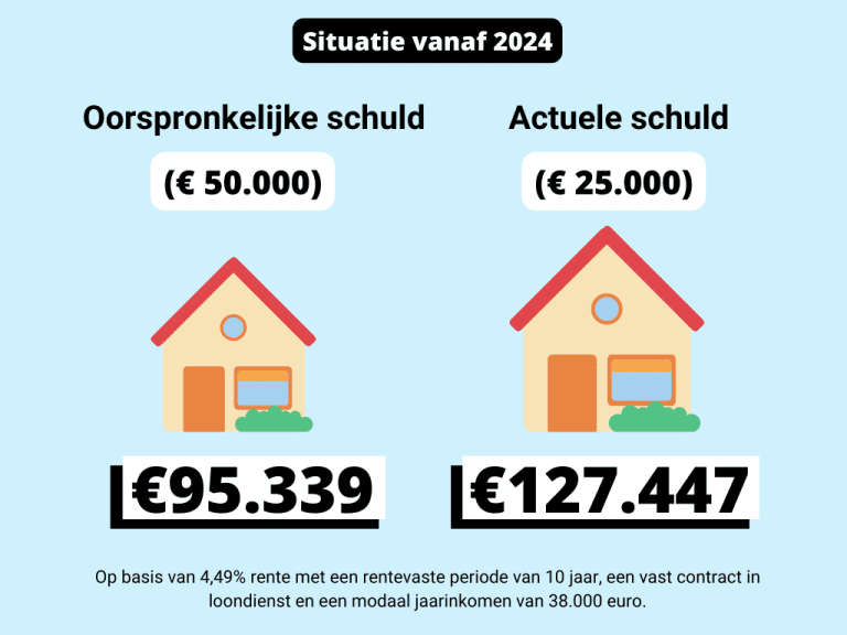 Het verschil in maximale hypotheek als er wordt gekeken naar de oorspronkelijke schuld en de actuele schuld. Dit is een versimpelde berekening, de precieze rekenwijze wordt nog uitgewerkt door de minister.