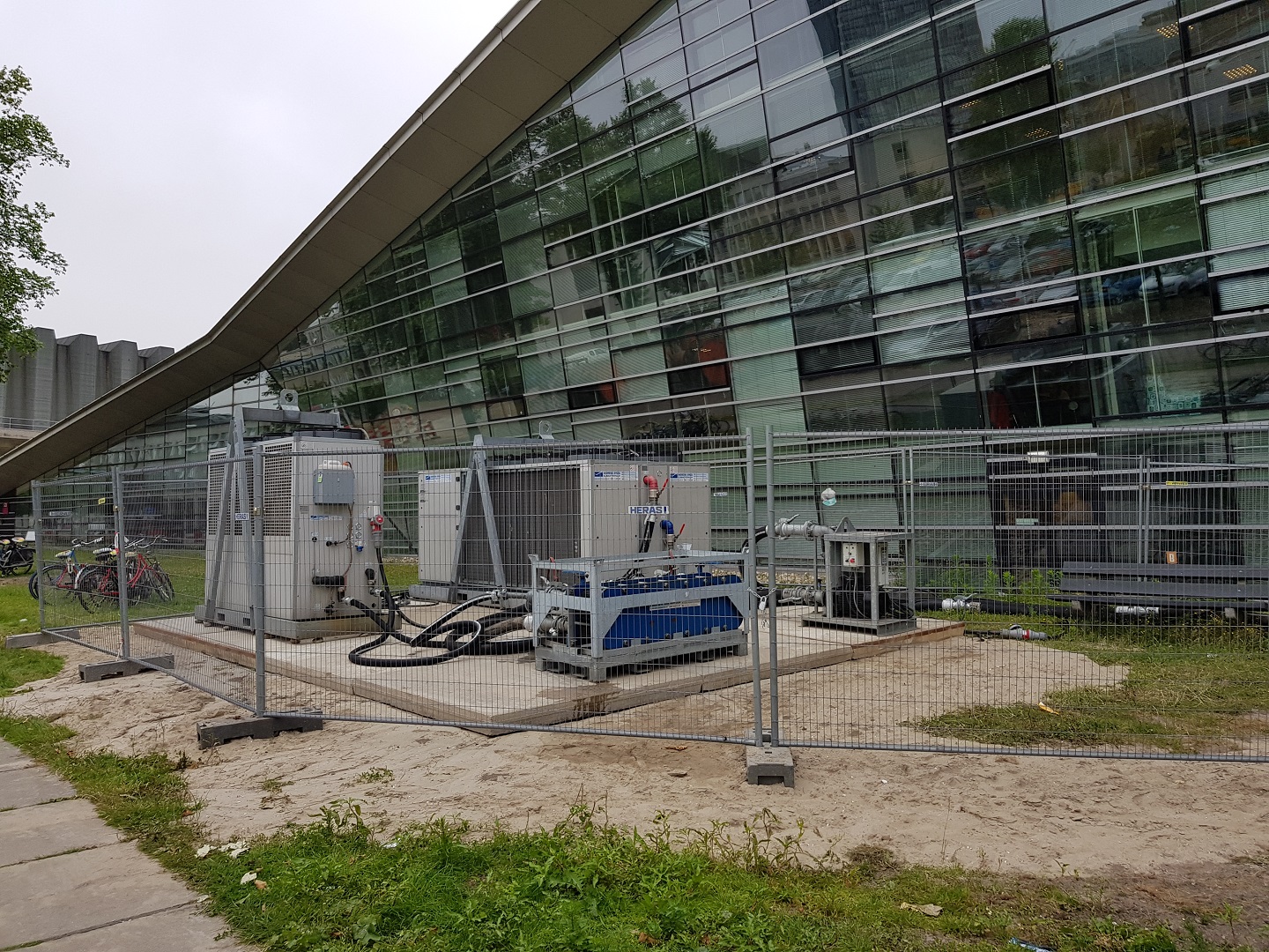Het koelsysteem van de TU Delft Library is nog steeds defect. Daarom zijn er vrijdag bij de personeelsingang twee airconditioners geplaatst als noodoplossing.