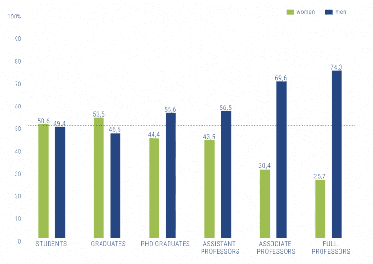 At the end of the monitor year of 2020, there were 3,555 professors at Dutch universities: 2,666 men and 889 women. Among the student body, the proportion of women (50.6%) is a little higher than the proportion of men. And the proportion of women (53.5%) who graduate is even higher. So why does the proportion of women later in the academic career path drop sharply? Even TU Delft’s ‘pipeline is leaking’, shows the gender diversity dashboard.