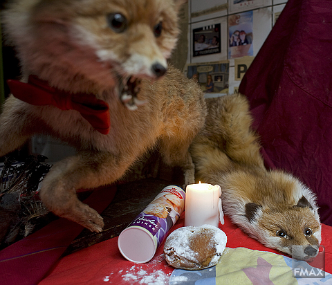 After an afternoon of toil in the kitchen, the table is soon overflowing with oliebollen and powdered sugar, ready for the party. The Vossen (Foxes), as club members are known, can choose to cover the oliebollen with powdered sugar beforehand. “But experience has shown that it’s better to throw a cloud of powdered sugar into a flame”, says Van Tricht, “as this creates a blowtorch-like effect.” In addition to the fiery clouds, many of the stuffed red-brown foxes get covered in powdered sugar and end up looking like arctic foxes!