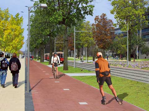 In mei 2007 start op de campus de aanleg van de tramrails voor lijn 19, die op drie verschillende haltes zal stoppen. Voor het zover is, moeten wel eerst de bekabeling, de riolen en een groot aantal parkeerplaatsen worden verplaatst. De vertrouwde roodgele HTM-tram heeft in 2007 misschien plaatsgemaakt voor een hightech model. Maar de maximumsnelheid op de campus blijft dertig kilometer per uur. (Illustratie: Mecanoo).