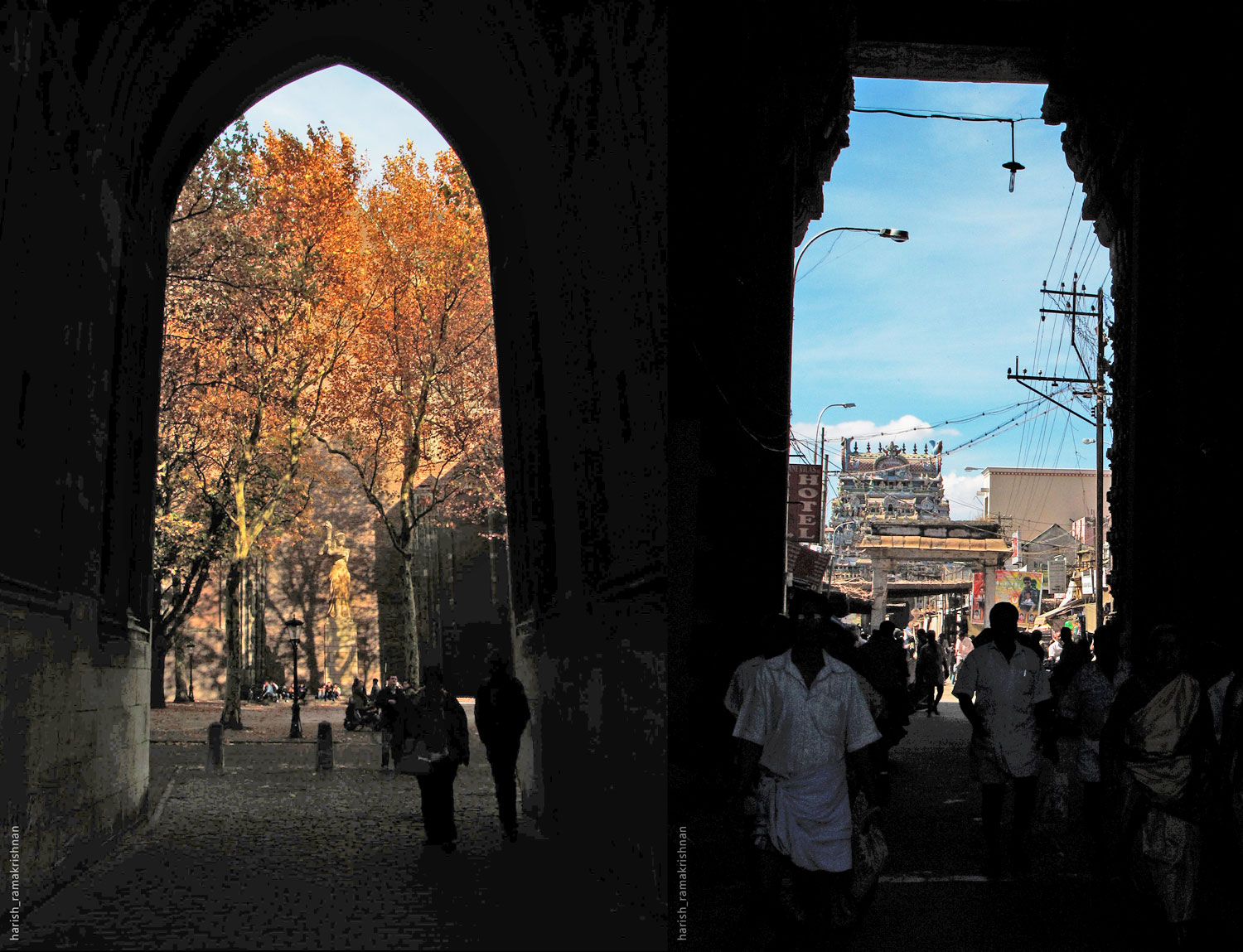 Similarly, Utrecht’s Dom Tower is a free-standing structure, owing to the collapse of its unfinished nave, formerly serving as the entrance to the Gothic Cathedral of Saint Martin, a beautiful structure that still exists, although separated from this tower by a few metres. These two structures of yore, both unfinished gateways, built 8,000 kilometres and two centuries apart, have been preserved and adapted to today’s cultural context. Utrecht’s gateway to a quiet calm (on the left), and India’s to clamorous chaos (on the right), merged together in photo form as similar gateways but to contrasting cultures.
