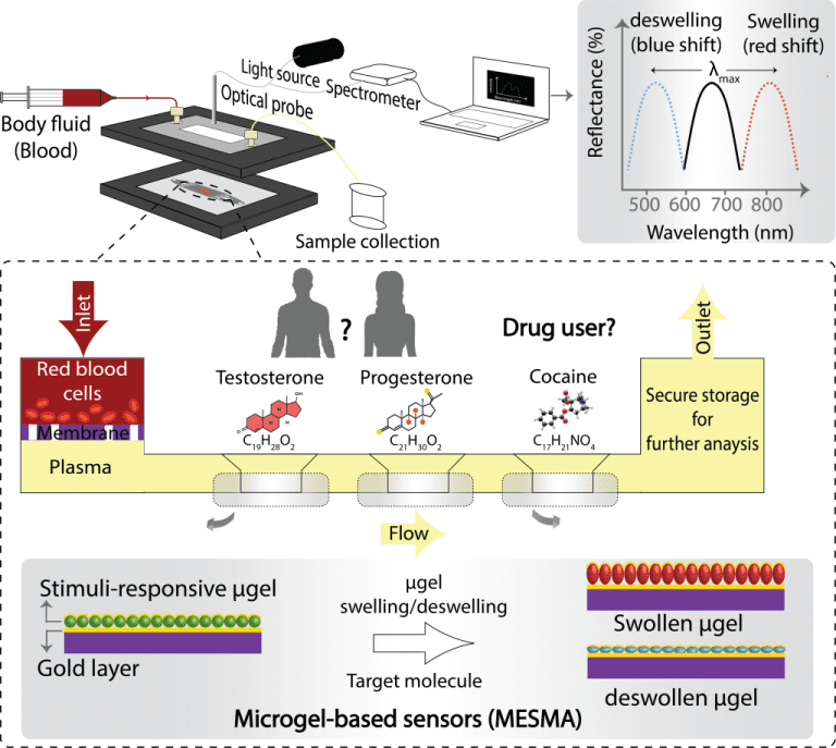 Microgel-based Etalon Spectrophotometry in Microfluidic Appliance (MESMA) works with microgels that have been made sensitive to specific molecules. If a drop of blood is placed at the inlet, only the blood plasma passes through the chip with microgels. Blood cells remain behind. If the plasma contains molecules for which the gel has been sensitised, the gel will swell or shrink, which will change the distance between the reflective layers sandwiching the gel. This variation in distance will change the reflected colour of the laser like a thin film of oil on water does. The presence of certain molecules (testosterone, progesterone, cocaine) will thus become detectable as a colour change in laser light.