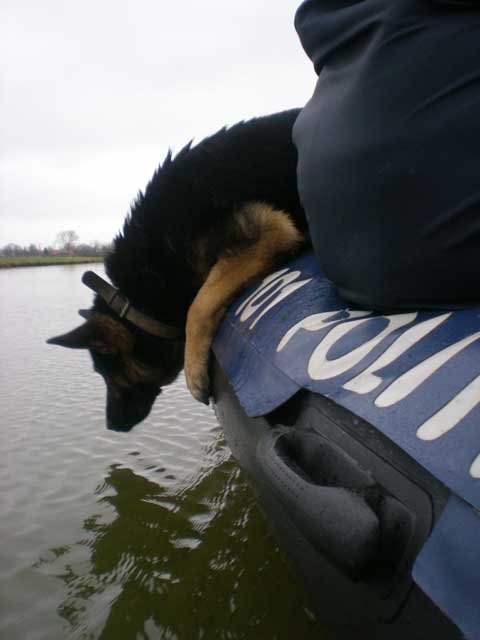 Lijken in het water worden in Nederland meestal opgespoord door snuffelende honden aan het wateroppervlak. Maar in de praktijk kan de plek waar het lijk op de bodem ligt tot honderden meters verwijderd zijn van waar de hond begint te blaffen. (Foto: Reinder Bil)