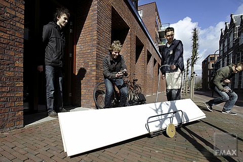 Een bouwvakker test een karretje om steigeronderdelen en ander bouwmateriaal te vervoeren. Het ontwerp is van eerstejaars IO-student Matthijs Vonk (in het midden met camera) en een aantal medestudenten.