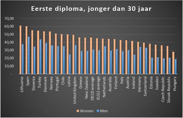 What percentage of men and women will obtain their first higher education degree before the age of 30? In all countries, women graduate earlier than men, but in the Netherlands the difference is relatively small. (HOP, Bas Belleman)