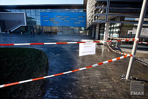 Glibberig zooitje voor de hoofdingang van Industrieel Ontwerpen, afgelopen dinsdag. Het plein was door onbekenden onder water gezet, dat bevroor door de vrieskou.