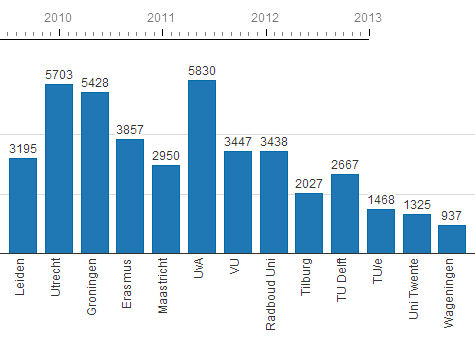 Alles bij elkaar blijft de UvA de grootste universiteit van Nederland met ruim 31 duizend studenten. Utrecht telt er bijna duizend minder en Groningen staat stevig op de derde plaats met ruim 27 duizend studenten.