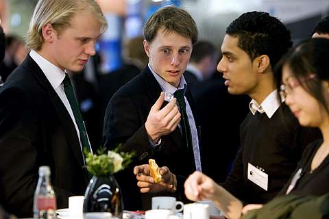 Een ijsblokje in de koffie? Gelukkig niet. Deze student verwondert zich over een plastic ijsblokje gevuld met vocht, dat hergebruikt kan worden. Het is een gadget van een van de vele bedrijven die zich presenteerden op de Delftse Bedrijvendagen.