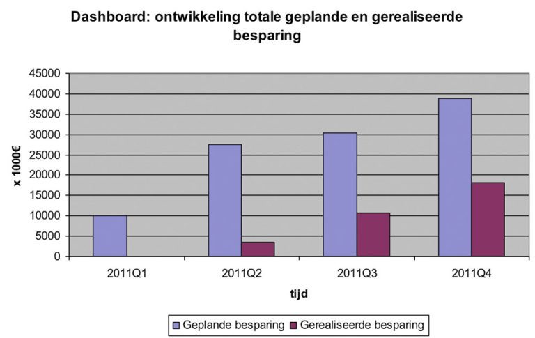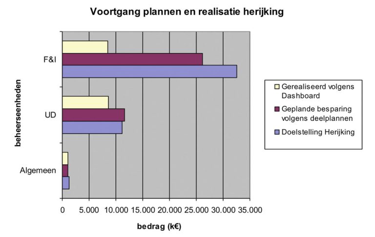 Ieder kwartaal inventariseert de taskforce herijking de voortgang van de herijking. De ‘geplande besparing’ is het totaal van verwachte besparingen per deelplan. De ‘gerealiseerde besparing’ is het totaal van besparingen die in de verschillende deelplannen gerealiseerd zijn. (Bron: Taskforce herijking)