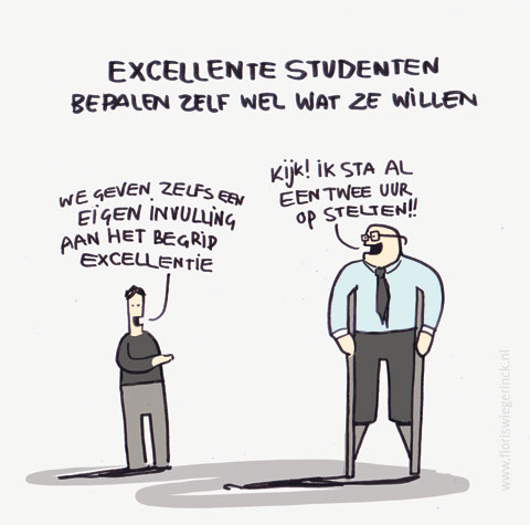 “We moesten onze invallen op gele briefjes schrijven en die dan op grote vellen plakken”, herinnert Vos zich. “Wat daar het meest uit naar voren kwam waren creativiteit, samenwerken met studenten van andere faculteiten en samenwerken met het bedrijfsleven.” Vos vertelt dat eenzelfde brainstorm met aankomende studenten vooral de wensen opleverde als ‘een dagje met de professor mee kunnen lopen’ of ‘mee mogen doen met onderzoek’. Maar na een jaar op de TU hebben in elk geval de excellente studenten kennelijk vooral behoefte om over de grenzen te kijken.