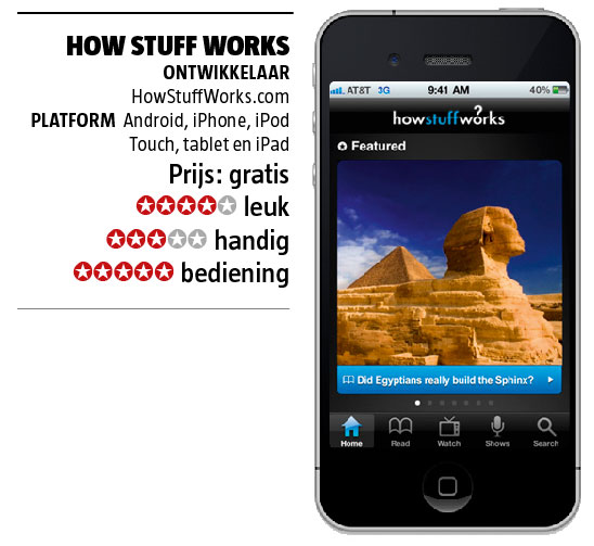 Met de toenemende populariteit van populairwetenschappelijke bladen en programma’s, is het niet zo gek dat de website HowStuffWorks.com miljoenen bezoekers trekt. Dus wat doe je dan? Dan hang je er een appje aan! Dat biedt toegang tot meer dan 30 duizend artikelen, video’s en podcasts. En quizzen, voor wie zich verveelt, plus de optie om met de podcasters zelf te chatten.