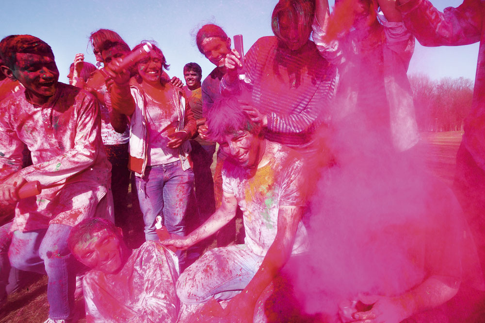 In een wolk van roze en rood (en geel , groen, blauw en paars) vierden Indiase studenten afgelopen zondag het Holifeest op de campus. Het Hindoeïstische feest Holi-Paghwa is zowel de viering van nieuwjaar, van de overwinning van het goede op het kwade als een lentefeest.