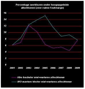 Afgestudeerden van niet-westerse afkomst kunnen een stuk moeilijker aan een baan komen dan autochtonen. Maar hoe groot het gat precies is? Het CBS publiceert wel cijfers, maar durft ze niet te duiden. Daarvoor is de foutmarge te groot. Het lijkt bijvoorbeeld alsof academici van niet-westerse afkomst in 2009 de werkloosheid zagen dalen, terwijl bijna alle andere groepen de economische tegenspoed voelden.