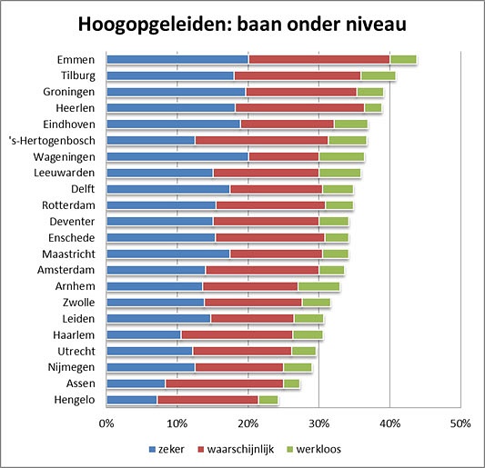 Grofweg één op de drie werkt dus onder zijn niveau. In het rapport staan vergelijkbare cijfers, al zijn ze een jaar ouder en zijn de achterliggende tabellen niet online beschikbaar. Klaarblijkelijk gaan hoogopgeleiden vaak aan de slag in eenvoudiger baantjes als ze geen werk op niveau kunnen vinden. Let wel, hierbij zijn de bijbaantjes van studenten buiten beschouwing gelaten, want die zijn nog niet afgestudeerd en gelden in de statistieken als ‘middelbaar opgeleid’.