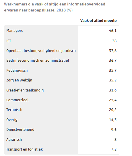 In 2018 had 28 procent van alle werknemers problemen met de hoeveelheid informatie die op hen afkomt. In 2014 was dat nog 25 procent. Hoogopgeleiden hadden daar bijna drie keer vaker last van dan werknemers met hoogstens een vmbo-diploma: 40 tegenover 14 procent. Dat blijkt uit de Nationale Enquête Arbeidsomstandigheden onder ruim 60 duizend werknemers, uitgevoerd door het CBS en TNO.