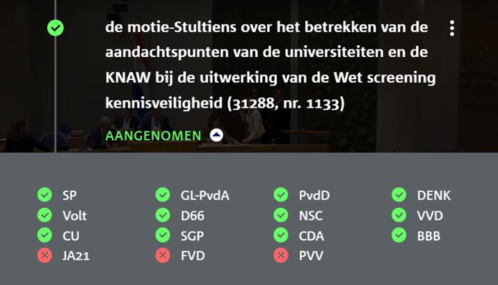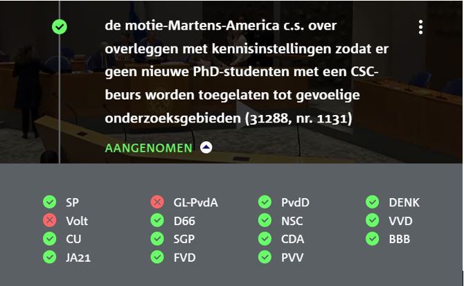 The motion (in Dutch) was tabled by the VVD and NSC political parties. The Minister of Education needs to talk with knowledge institutions about preventing Chinese PhD candidates on CSC scholarships having access to sensitive areas of research. Almost all the parties were in agreement, although the motion does not state what areas of research it means.
