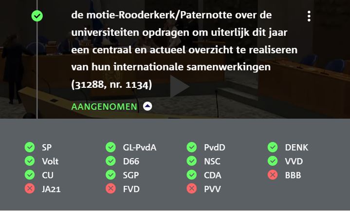 The Rooderkerk/Paternotte motion on instructing universities to achieve a central and up-to-date overview of their international collaborations no later than this year.