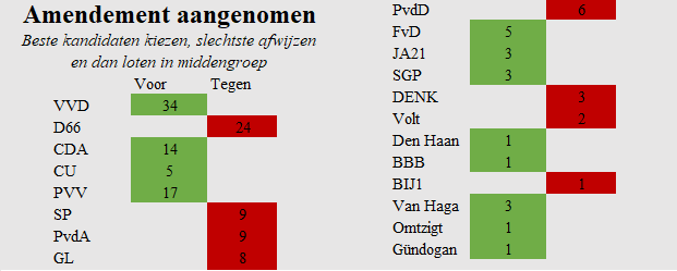 Amendment adopted: choose best candidates, reject weakest and then draw lots in middle group. Green is in favour, red is against.